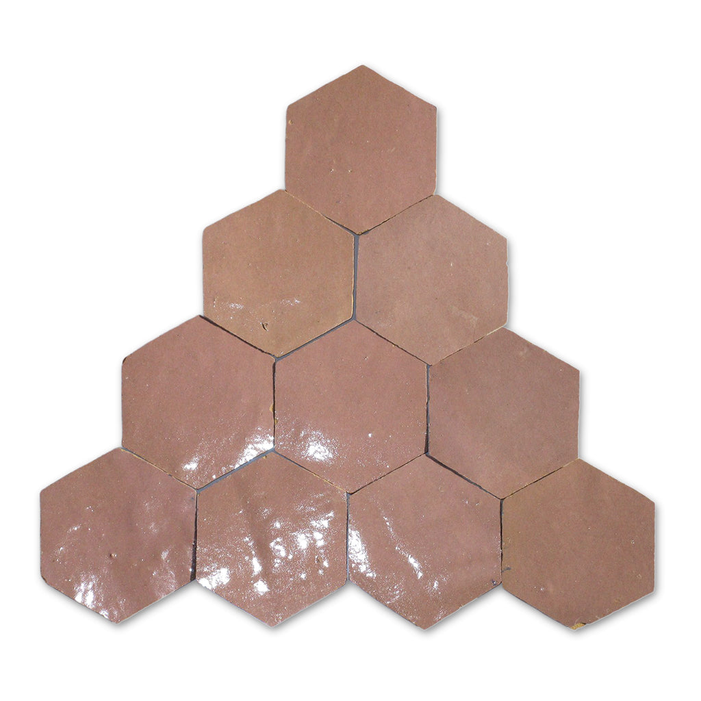 Authentic Agadir Flammed Zellige tiles. Hand-pressed 9x9 cm hexagons featuring dramatic tonal variations for high-end, organic interiors.